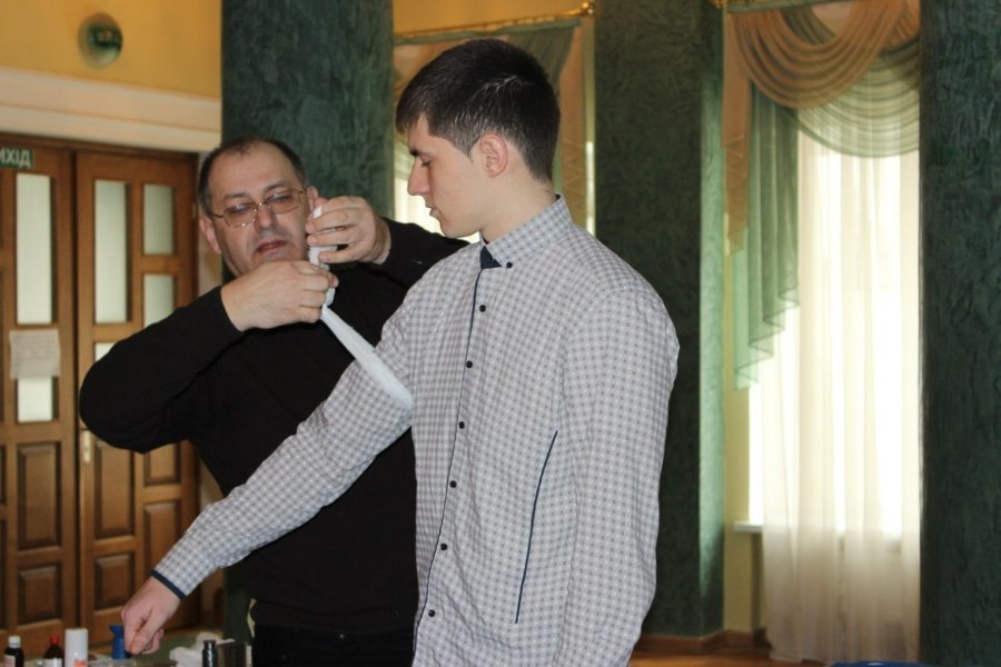 Ігор Корнійчук розповів, як поводитися із різного роду травмами і наголосив, що першочергове завдання того, хто надає невідкладну допомогу – це припинення кровотечі та дезинфекція поранення. Присутні дізналися які види кровотеч найнебезпечніші і як діяти при кожній з них. Лікар наголосив, що за екстренних ситуацій, коли на карті стоїть життя людини, потрібно використовувати усі підручні засоби.