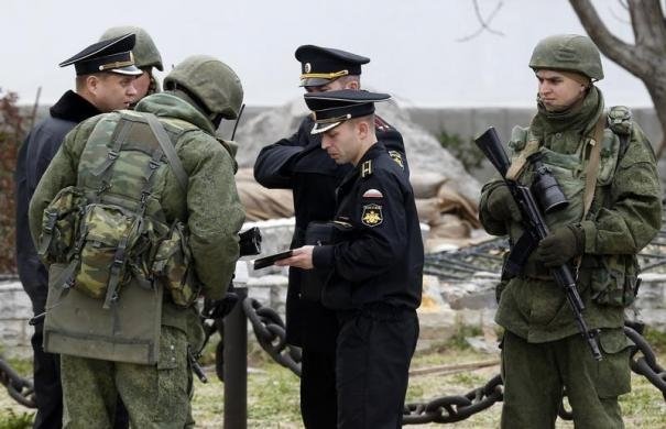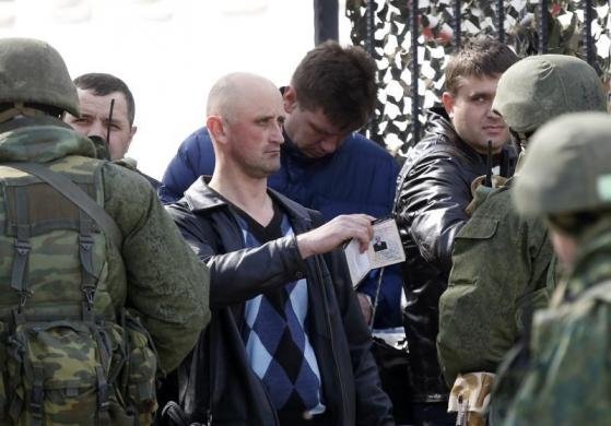 Українських офіцерів та контрактників змушують покидати свої робочі приміщення. Українські військовослужбовці по одному виходять із управлінь, відділів та служб під вигуки проросійськи налаштованих радикалів «Росія, Росія!».