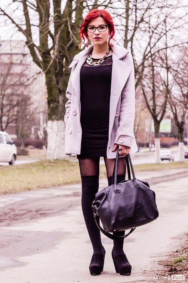 Дівчина стильна. Щоправда сумка занадто масивна. До її образу краще виглядала б сумка менша за розміром на довгу шлею, так би вона доповнювала образ жіночністю. Довжина панчіх, які зараз в моді, в гармонії із довжиною сукні. Прикраси дуже гарні та всі вдало підібрані. Окуляри стильні, вдало підкреслюють образ. Довжина пальто та сукні для героїні підходять. Щоправда взуття не дуже добре «вписується в образ» – воно, як «праски». Набагато краще було б, якби воно було на низькому ходу, навіть масивне.