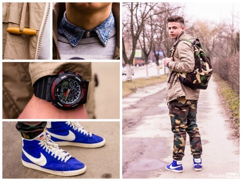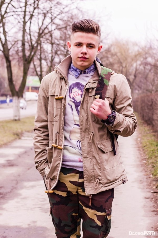У хлопця бачимо конкретно – стиль мілітарі. Все підібрано по кольоровій гаммі. Така куртка як у нього зараз модна. Навіть зачіска підходить до цього стилю. Одне єдине зауваження – це кросівки яскравого синього кольору, які беруть на себе зайву увагу. Трикотажна кофта не має гармонії з камуфляжними штанами. Значно краще було б, якби взуття було в тон куртки або просто чорне.