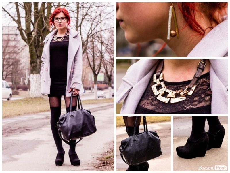 На фото Маша одягнута у пальто, сукню КІКІ-РІКІ, взута була у ботики. Образ дівчина підкреслила сумкою, масивним намистом від ZARA, окулярами та перснем.