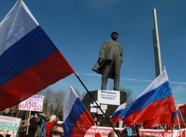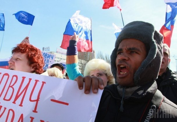Учасники акції тримали у руках російські прапори та скандували «Референдум», «Губарєв». В руках вони тримали також плакати «Янукович - захисти Донбас», «Янукович, повернись», «Ні фашизму», - пише ТСН.