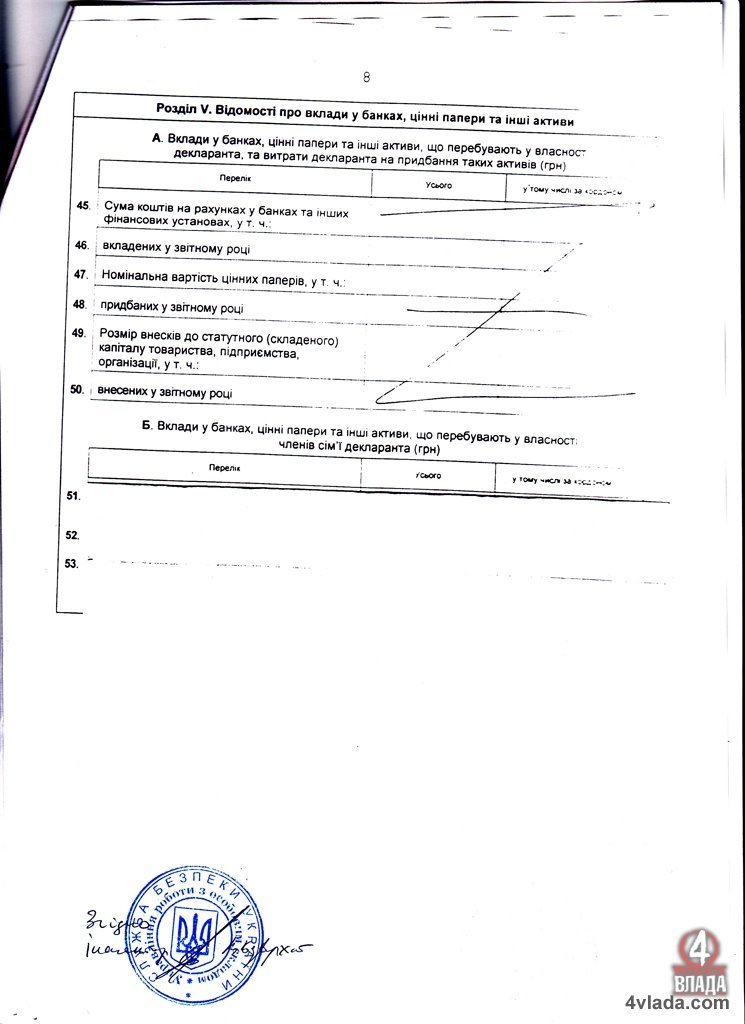 Як видно із документів, наданих в СБУ, начальник управління СБУ таки має якихось членів сім’ї, які у 2012 році отримали більше 370 тисяч гривень доходів (36 тисяч – заробітна плата, 320 тисяч – дохід від відчуження рухомого і нерухомого майна і 14 тисяч 193 гривні – інші види доходів). Про майно посадовця і його членів сім’ї не відомо, бо ці сторінки відсутні.