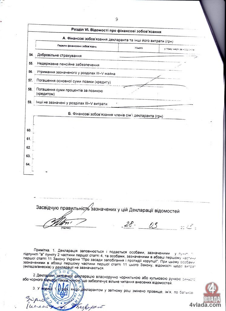 В усіх трьох деклараціях про майно, доходи, витрати і зобов’язання фінансового характеру відсутні сторінки про майно декларантів і майно їхніх членів сім’ї, про транспорт членів сім’ї, а також закрита інформація про їхні вклади у банках та цінні папери і фінансові зобов’язання. Не відомо власне і хто ті члени сім’ї та скільки їх.