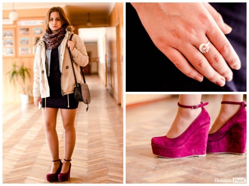 На фото дівчина одягнута у куртку H&M, джинсову куртку CHILLIN, сукню INCITY та туфлі VAGABOND. До загального образу Галина підібрала сумку WITTCHEN, та жіночну каблучку під сукню.