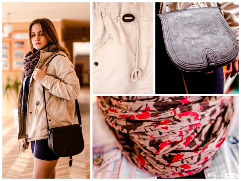 Куртка краще дивиться зі штанами, ніж із сукнею. Шарф не підкреслює образ і не додає елегантності, через свої кольори. Сумка теж не підходить, а ні до куртки, а ні до взуття.