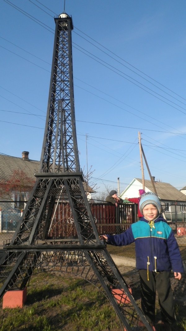 «Скрізь, де тільки не бував, у дворах бачив багато саморобних буслів, возів, лебедів, діжок, грибів, гойдалок… І захотілося собі зробити щось таке, чого ні в кого немає. А тут у передачі «95 кварталу» на сцені побачив Ейфелеву вежу, то й надумав її зробити. Внук роздрукував мені з Інтернету кілька фотографій вежі, а я вже по них робив свій витвір. Три місяці над нею трудився, поки позварював усе докупи, потім десь зо два тижні фарбував. Зверху поставив своєрідний ресторанчик, всередину помістив сонячну батарею, яка за день набирає світлової енергії, тож вночі освітлюється уся вежа. Планую такі ж батареї встановити на першому і другому ярусах, аби світло уночі було більш яскравим», - розповів шачанин.