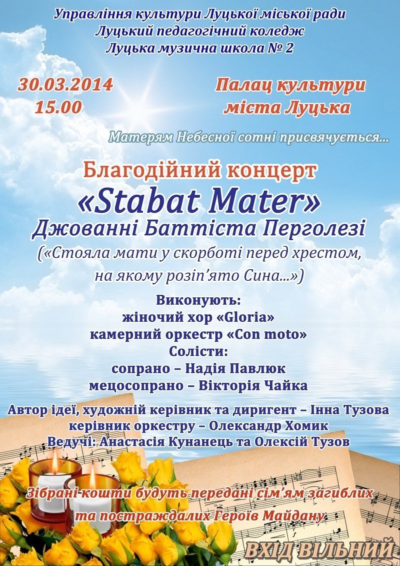 З ініціативи управління культури Луцької міської ради, Луцького педагогічного коледжу та Луцької музичної школи №2 презентують мистецький проект «Stabat Mater».