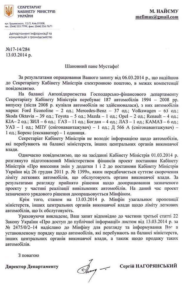 Журналіст Мустафа Найєм направив в Секретаріат Кабінету міністра запит і отримав відповідь про склад автопарку, який будуть продавати на публічних торгах.