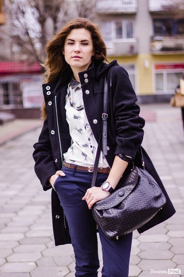 Дівчина Style. Правильно підібраний фасон брюк – класичний, які гарно допасовані по фігурі. Блузка на героїні зараз модна, насамперед через свій цікавий принт графічних оленей, яких вдало підкреслює прикраса. Пальтечко з капюшоном стильне, у тренді.