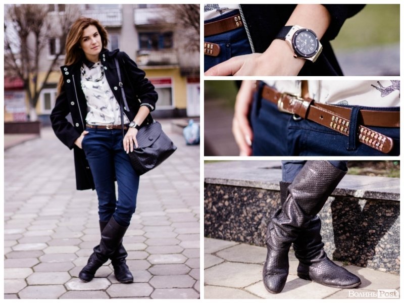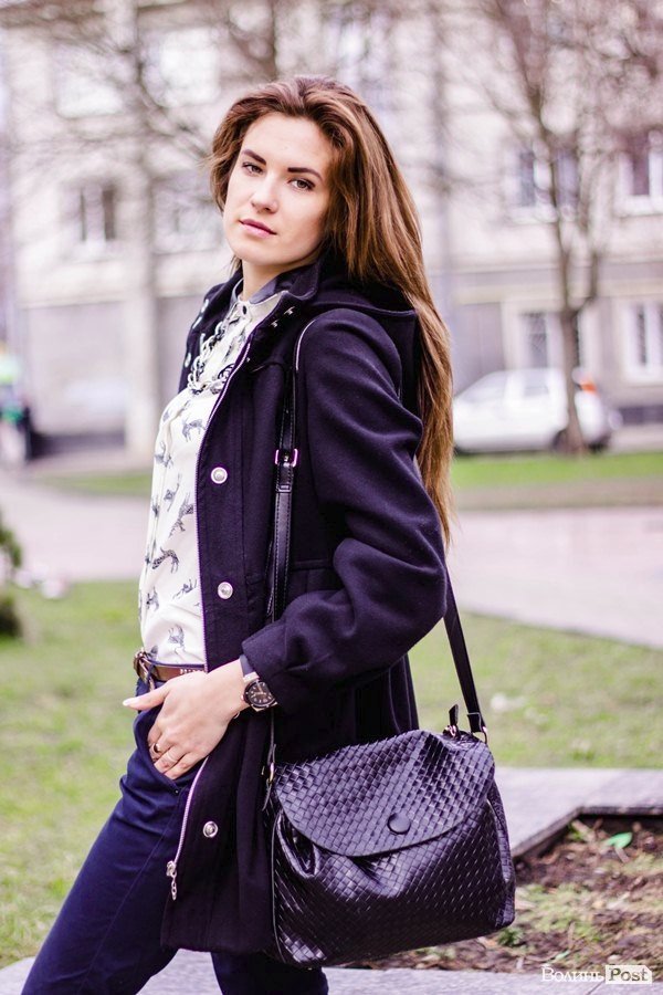 На фото Ірина одягнена у пальто від UNITED COLORS OF BENETTON, сорочку ZARA, штани від DIESEL та чоботи B&G. І як же без аксесуарів? Їх дівчина підібрала з розумом: зручна сумка VALENTINO, годинник HUBLOT, персні та кольє.