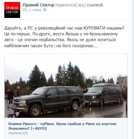 "Даруйте, а ПС у революційний час мав КУПУВАТИ машини? Це по-перше. По-друге, везти Яроша у не-броньованому авто - це злочин недбальства. Якось не дуже хочеться найближчим часом бути і на його похоронах..."