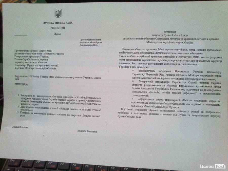 Лідер «Правого сектора» на Волині, депутат Луцькради Павло Данильчук попрохав у колег-депутатів прийняти звернення до в.о. президента України, спікера ВРУ Олександра Турчинова, Генпрокурора і голови СБУ з приводу політичного вбивства активіста «Правого сектора» Олександра Музичка та критичної ситуації в органах МВС.