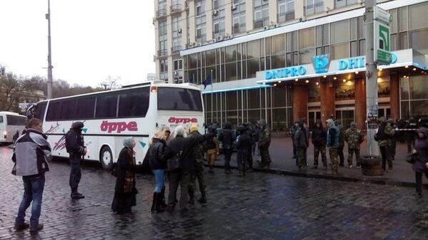 Бійці «Правого сектору» покидають приміщення готелю «Дніпро» в центрі столиці.