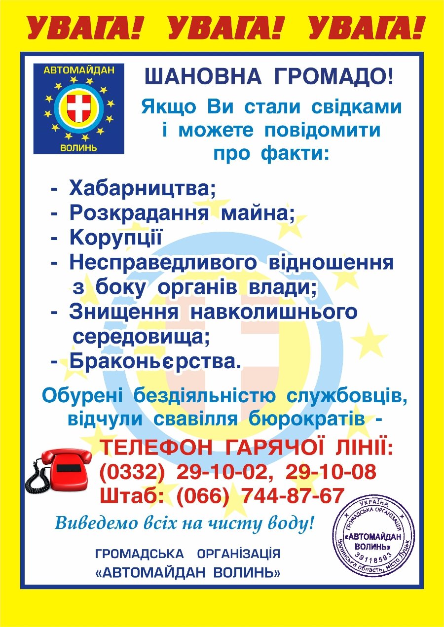 Автомайданівці розклеювали інформаційні оголошення, у яких закликають телефонувати на гарячу лінію, якщо хтось зіткнувся з фактами корупції, хабарництва, розкрадання, - повідомили у прес-службі «Автомайдан Волинь».