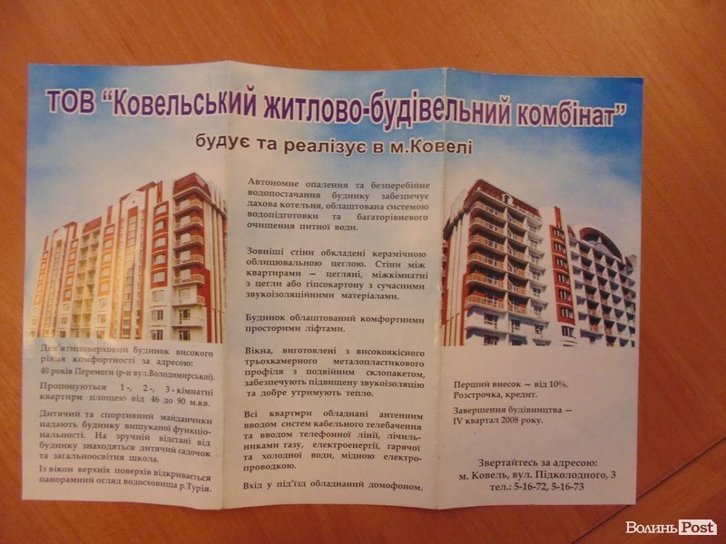 За словами однієї із ошуканих вкладниць Анни Гінайло, у 2007 році ТзОВ «Ковельський житлово-будівельний комбінат» проводив активну кампанію із залучення коштів для будівництва двох багатоквартирних будинків на вулиці 40 років Перемоги, 10 та С.Бандери, 10 у районному центрі.