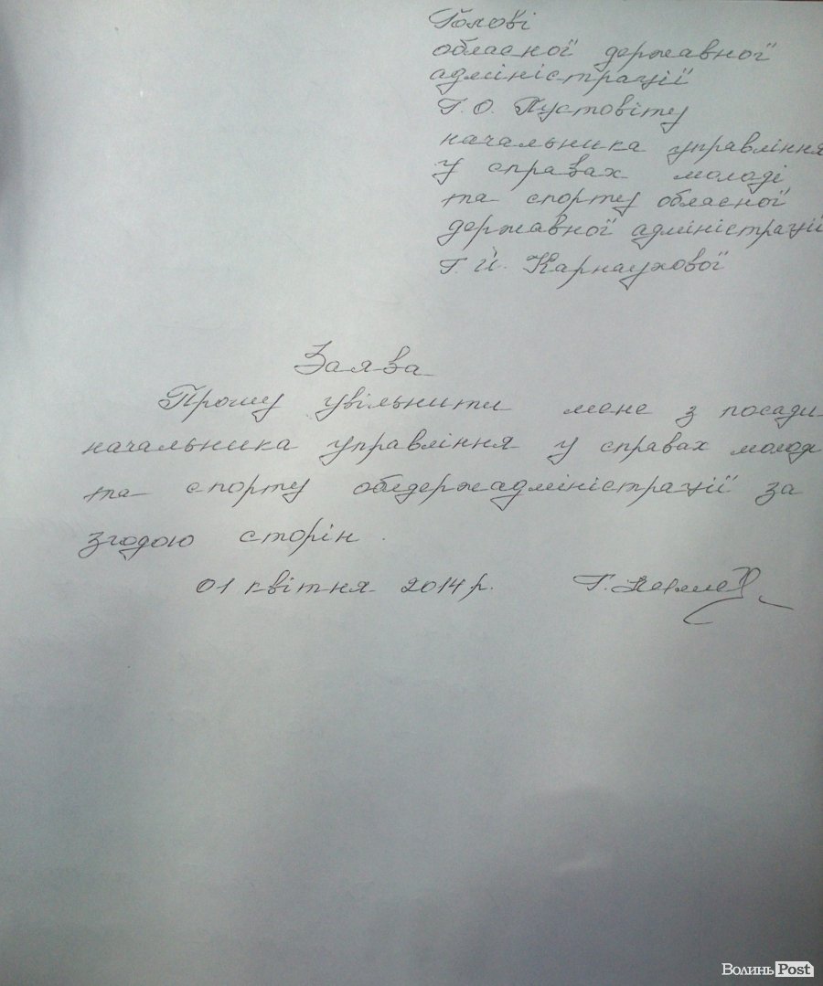 Начальника управління молоді і спорту Волинської ОДА Галину Карнаухову попросив написати заяву про звільнення заступник голови Волинської ОДА Роман Карпюк.