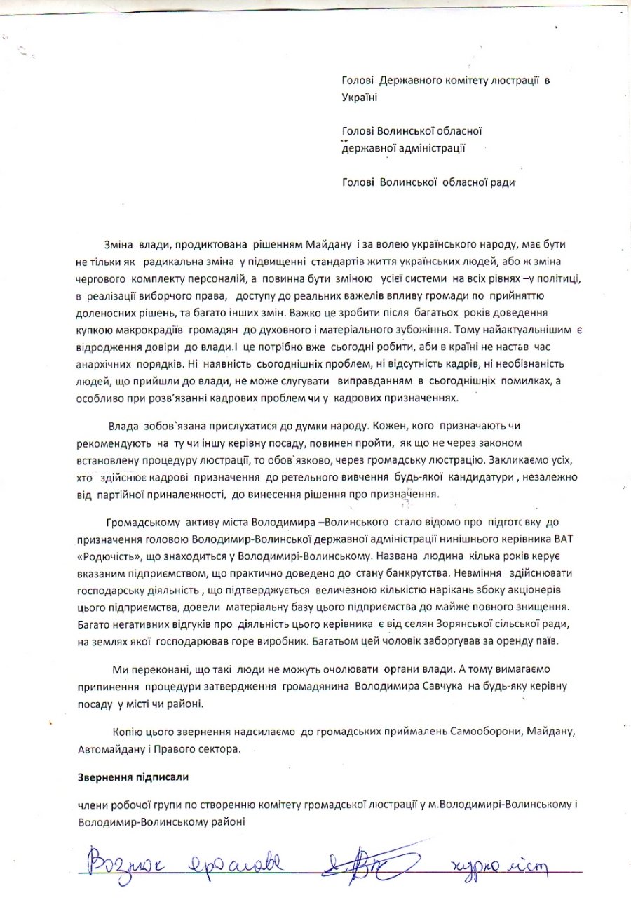 У Володимирі-Волинському громадські активісти просять не призначати керівника ВАТ "Родючість" Володимира Савчука на посаду керівника райдержадміністрації.