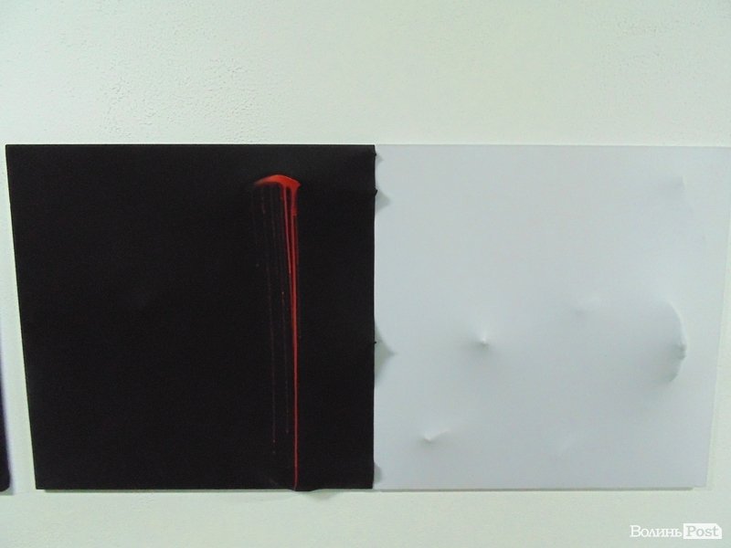 «Частина роботи із червоним патьоком, це порівняння з кров’ю. Це рефлексія на події лютого, коли були дуже жахливі події в Україні. Це був мій внутрішній стан, я його мусив викласти на щось», - розповів митець.