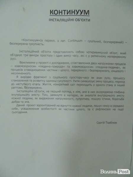 «Континуум перекладається як суцільний, безперервний. Інсталяція захоплює три виміри простору та один вимір часу, який перебуває у постійному, русі. Даний проект розрахований на відчуття кожної людини, це пошук особистості, пошук сенсу всередині себе, усвідомлення себе як частини людства», - пояснив Торбінов.