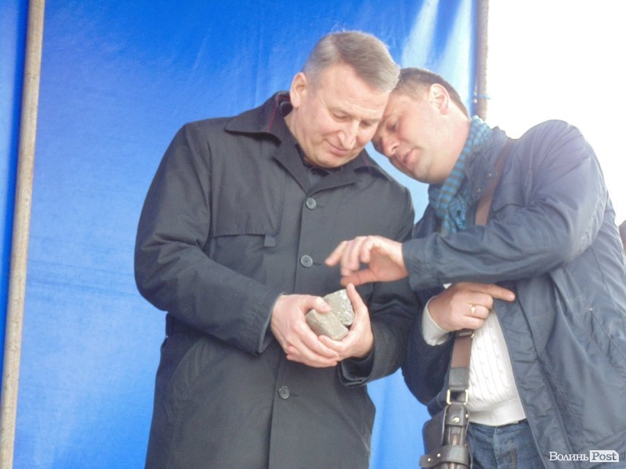 Під час недільного віча у Луцьку 6 квітня прокурору Волинської області Анатолію Коцурі вручили два шматки бруківки, привезеної з Києва.
