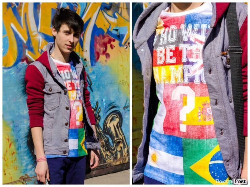 На фото хлопець одягнений у кофту, футболку, штани, кросівки. В образі присутні також аксесуари: сумка, годинник, браслет та окуляри.