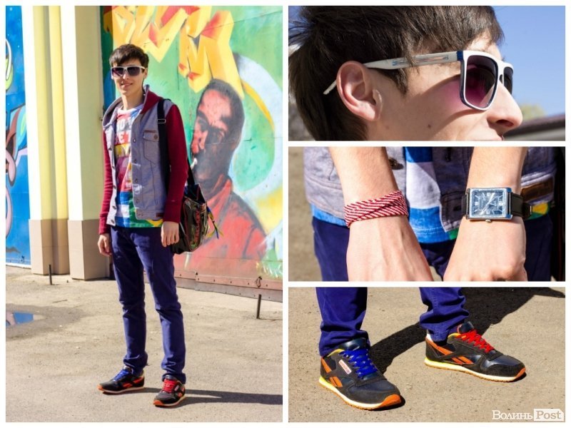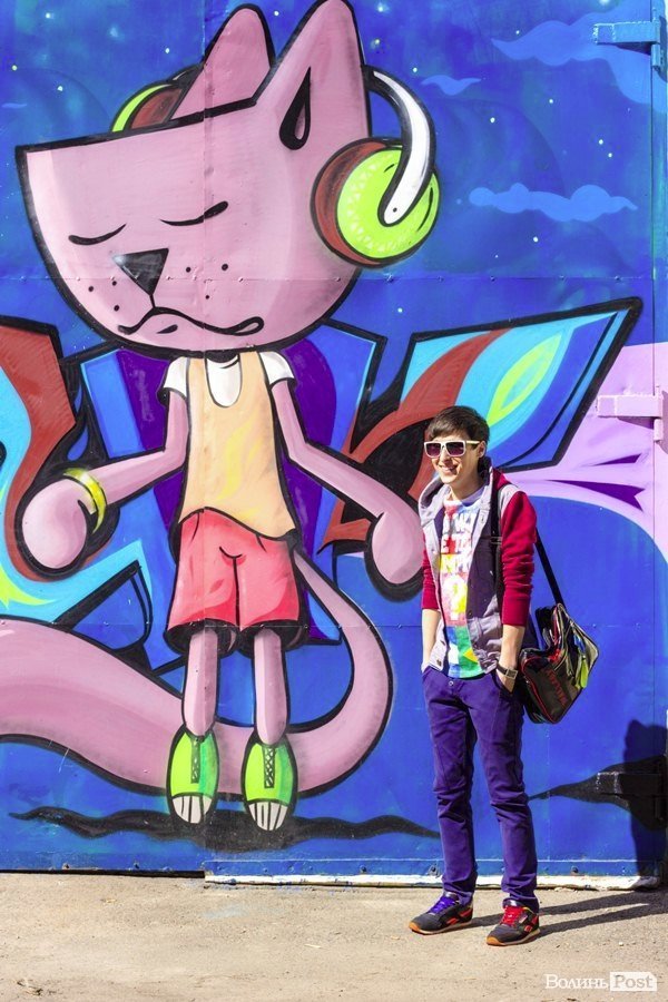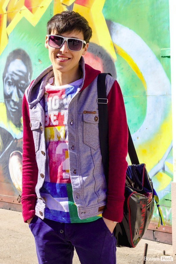Цього «яскравого» хлопця ми зустріли поблизу Палацу культури Луцька. Як виявилося, він студент училища культури та мистецтв, майбутній режисер. Також хлопець намагається розвивати у собі творчі здібності та задатки.