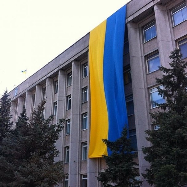 На Херсонській міськраді повісили гігантський прапор України. ФОТО