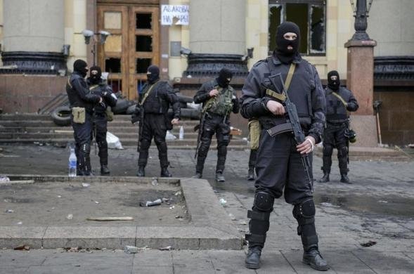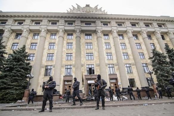 Фото озброєних людей в масках, які представляють український спецназ, стоять на варті зовні будівлі обласної адміністрації в Харкові.