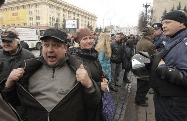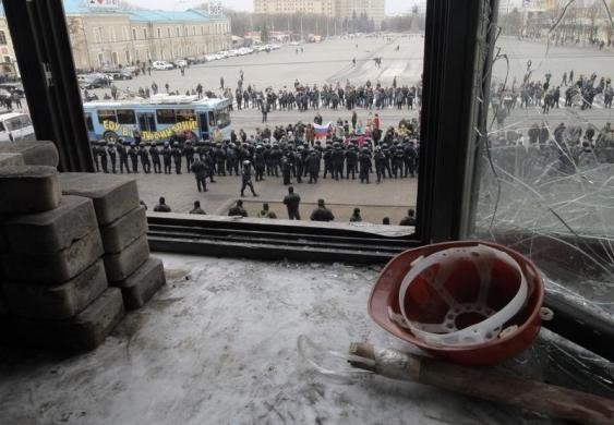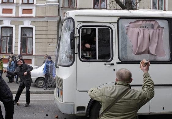 Зокрема є знімок, як проросійські сепаратисти кидають камені в автобус МВС біля будівлі обласної адміністрації у Харкові 8 квітня.