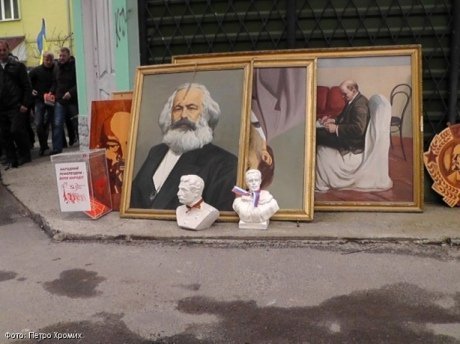 Як переконують керівники акції, портрети та бюсти вони передадуть до музею. Літературу та друковані періодичні видання було одразу спалено на подвір’ї будинку