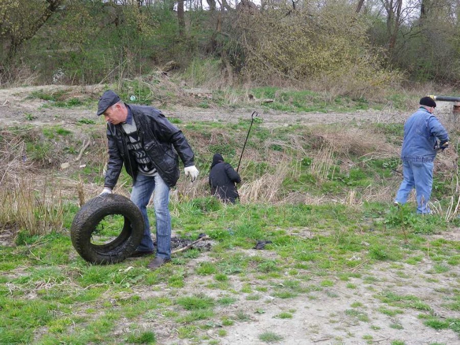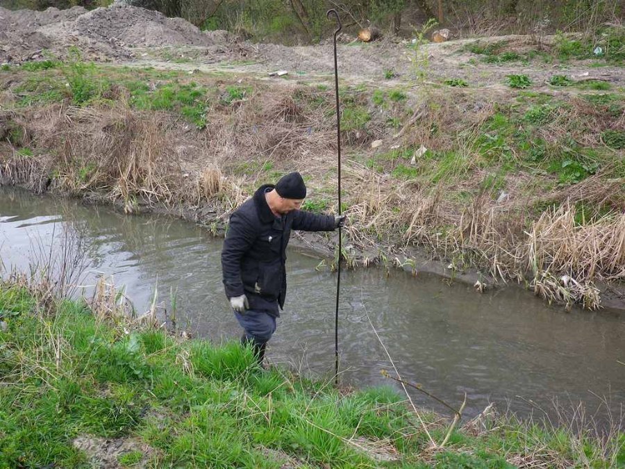 Згодом трудівники вирушили до берега річки. Там близько 7 людей почали прибирати сміття і виловлювати його з водойми. Для цього в одного з чоловіків було спеціальне приладдя – довга палиця з гаком на кінці. Як пояснив прибиральник, палиця називається багор і її використовують для вилову сміття з води.