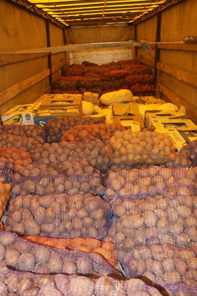 Асоціація фермерів завантажила вантажівку продуктів - ковбасою, картоплею, консервами тощо.