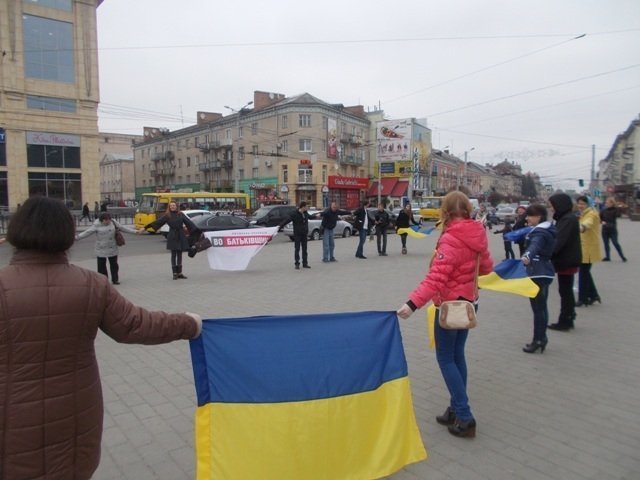 Декілька десятків людей сьогодні, 12 квітня, зібралися в центрі міста для того, аби долучитися до Всеукраїнської акції «Ланцюг єднання».