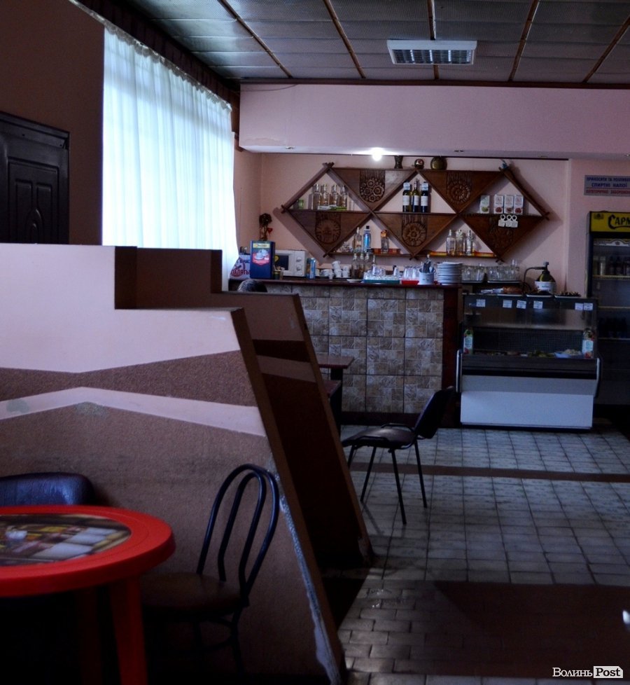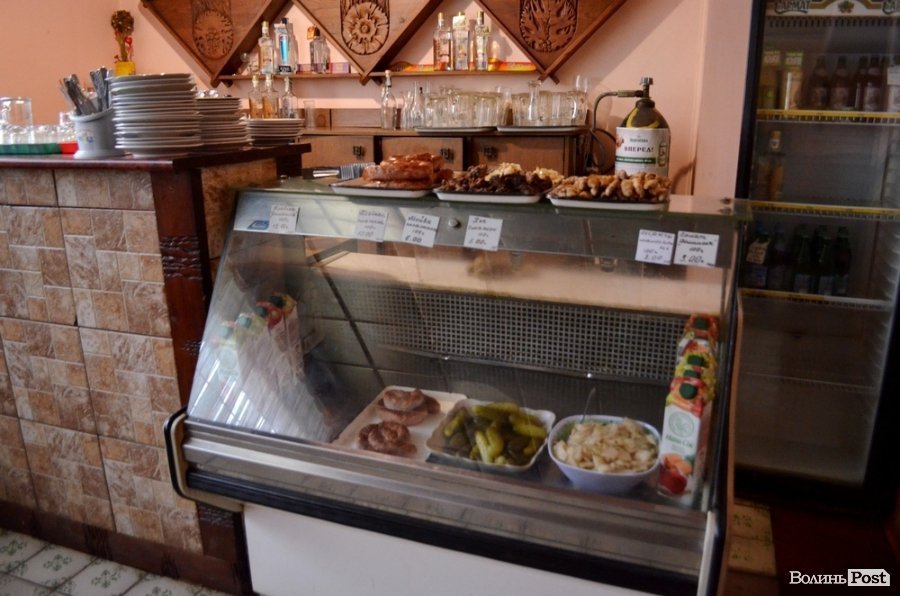Праворуч – вітрина. Уявіть: печінка з цибулею, домашня ковбаса, квашені огірки, смажена мойва, декілька рибинок хека і капуста по-волинськи. На стійці – перевернуті на підносі стопки, склянки, пивні бокали, якийсь незрозумілий кавовий апарат (зовсім не в тему, - авт.), кілька пляшок горілки і холодильник з пивом і мінералкою.