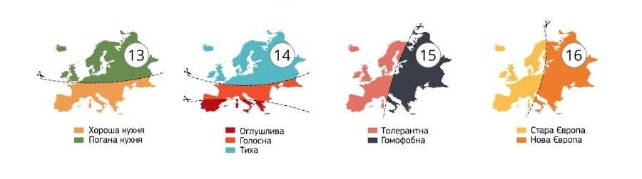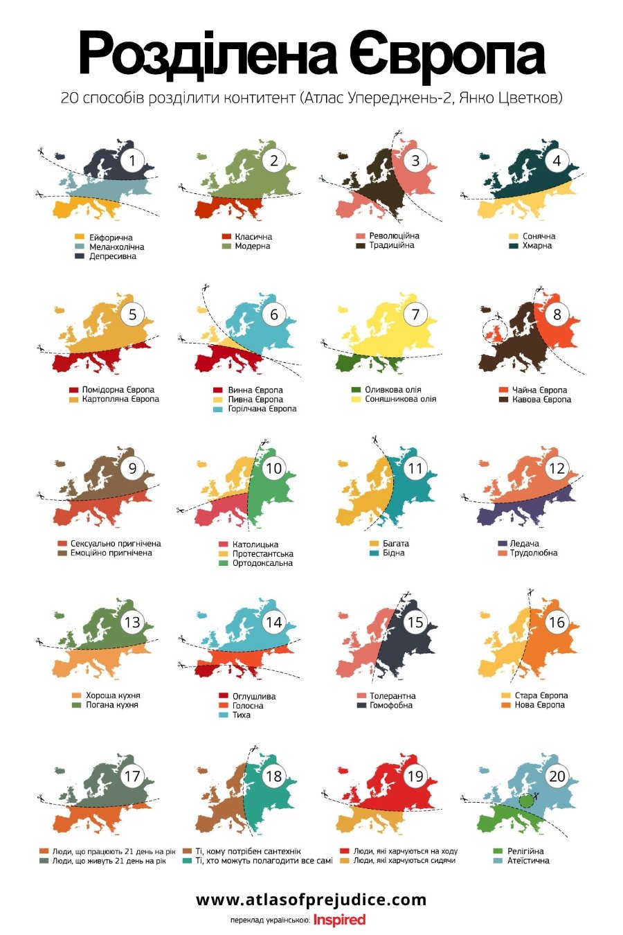 В якості невеликого інтро до книги, Янко опублікував цікаву інфографіку, в якій показує, як можна розділити Європу за такими буденними ознаками, як вживання олії чи віросповідання.