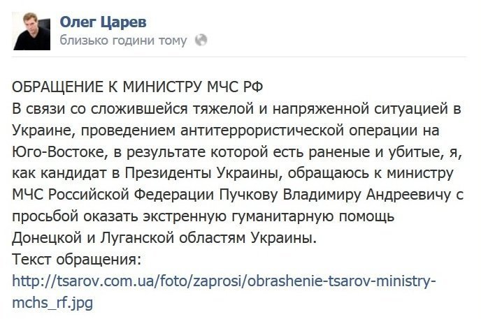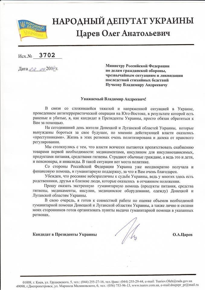 "У зв'язку з важкою і напруженою ситуацією, що склалася в Україні, проведенням антитерористичної операції на південному Сході, внаслідок якої є поранені та вбиті, я, як кандидат у президенти України, звертаюся до міністра МНС РФ Пучкова Володимира з проханням надати екстрену гуманітарну допомогу Донецькій і Луганській областям України", - йдеться у зверненні Царьова.