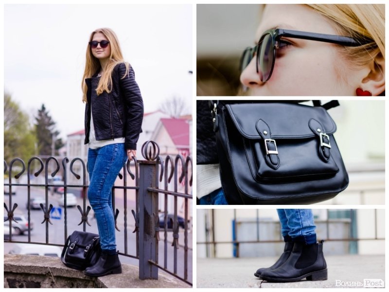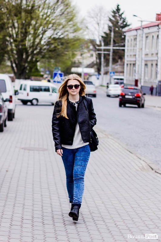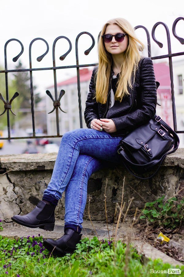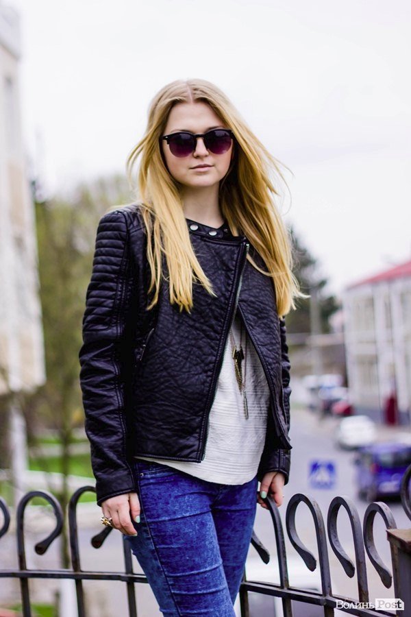Куртка гарна – зараз саме в тренді стьогані речі, тому вона привертає на себе увагу. Джинси і кофта звичайні, а взуття модне.