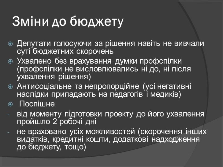 Зокрема видатки на освіту зменшили на понад 10 мільйонів, на медицину - більше 2,4 мільйона, на культуру - більше 2,5 мільйона гривень.