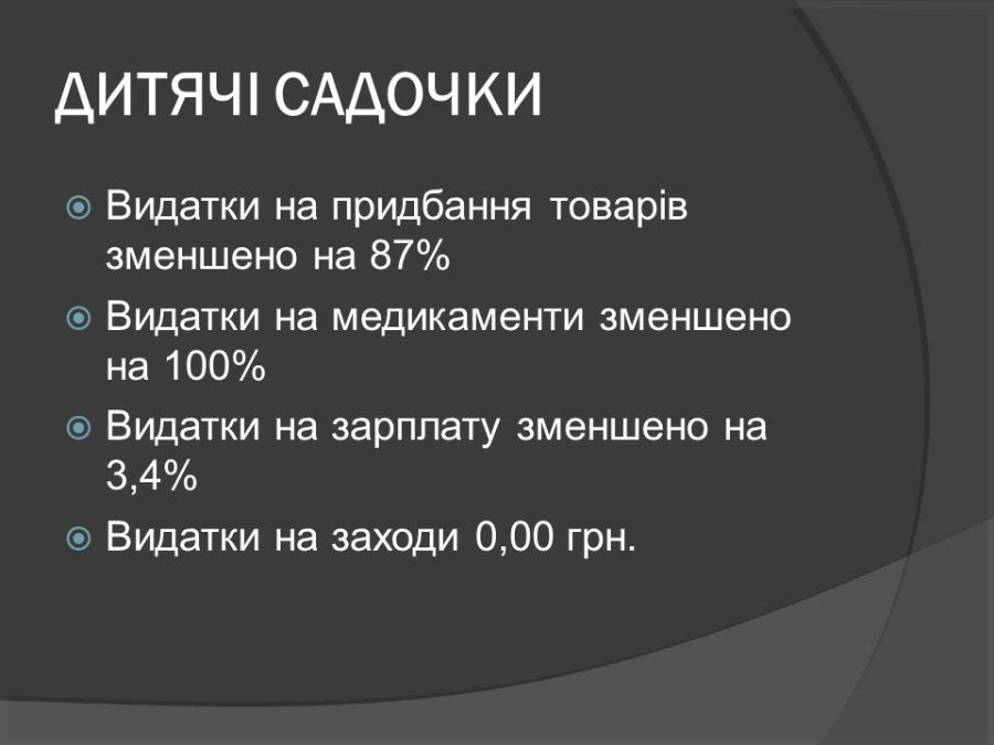 Для дитячих садочків витрати на медикаменти та на проведення заходів взагалі не передбачили. Також урізали витрати на закупівлю товарів.