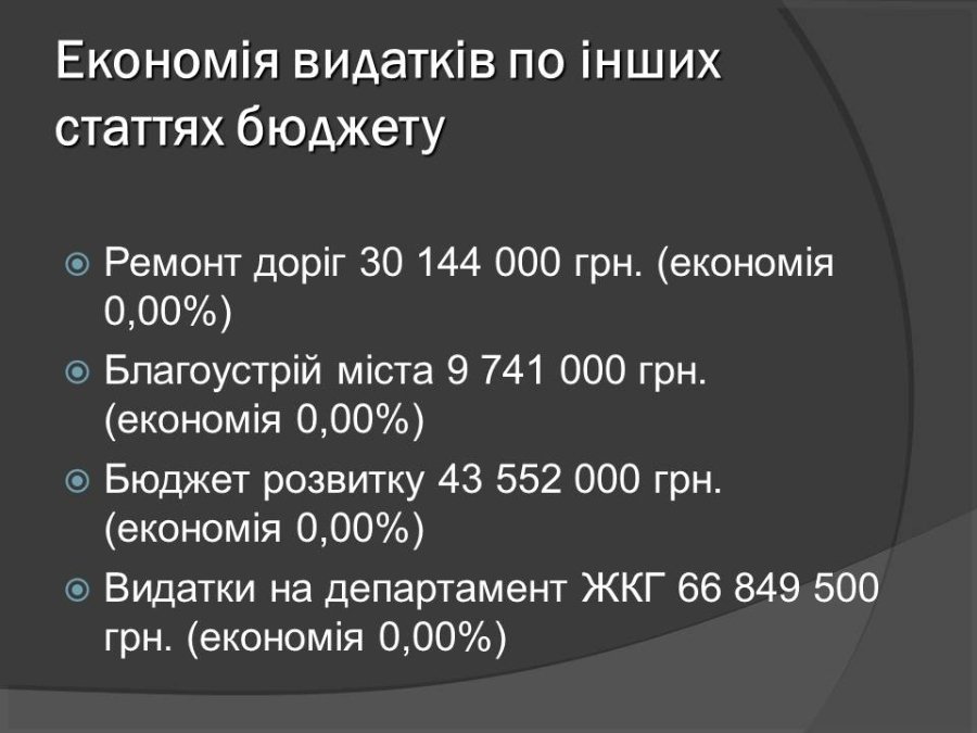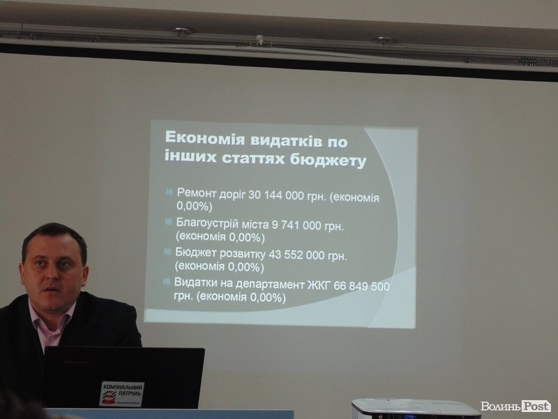 За словами Андрія Осіпова, зовсім не зменшили видатки на ремонт доріг (більше 30 мільйонів гривень), благоустрій Луцька (9,7 мільйона гривень), бюджет розвитку (43,5 мільйона гивень) та видатки департаменту ЖКГ (66,8 мільйона гривень).