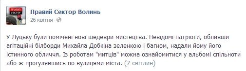 «У Луцьку були помічені нові шедеври мистецтва. Невідомі патріоти, обливши агітаційні білборди Михайла Добкіна зеленкою і багном, надали йому його істинного обличчя. Із роботам «митців» можна ознайомитися у альбомі спільноти або ж прогулявшись вулицями міста», - йдеться у повідомленні.