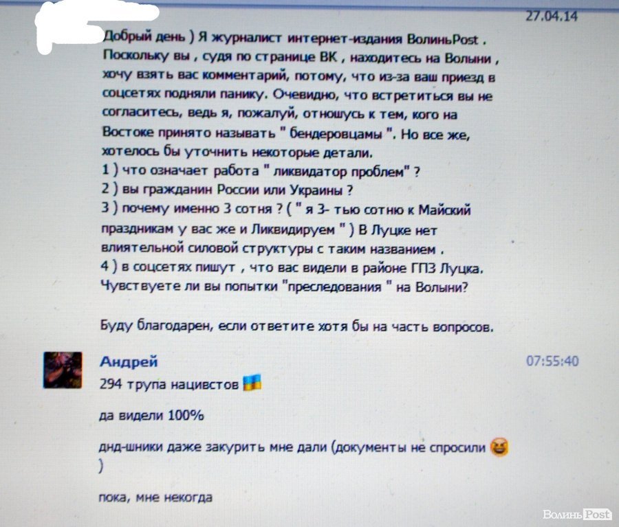 Водночас на запитання: "вы гражданин России или Украины?", "почему именно 3 сотня? ("я 3-тью сотню к Майский праздникам у вас же и ликвидирую") В Луцке нет влиятельной силовой структуры с таким названием", "Чувствуете ли вы попытки "преследования" на Волыни?" користувач не відповів.