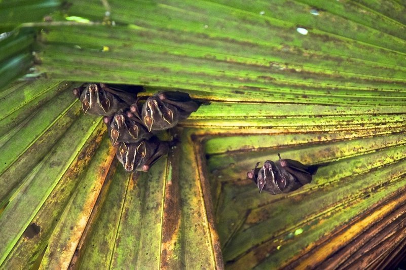 Іноді кажани бувають красиві. Крихітні кажани ледь помітні на листках у тропічному лісі на Коста-Ріці. (Фото: Brendene Barkley / National Geographic Traveler Photo Contest)