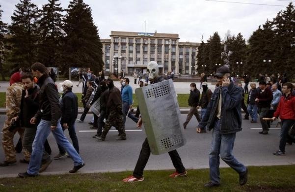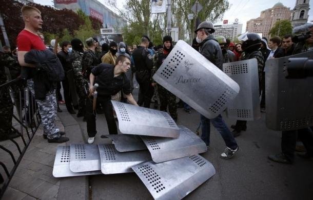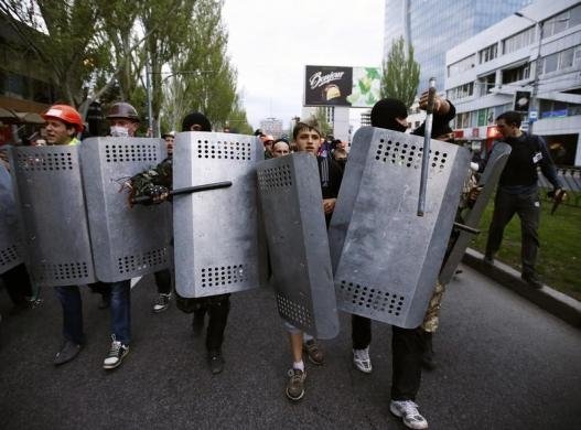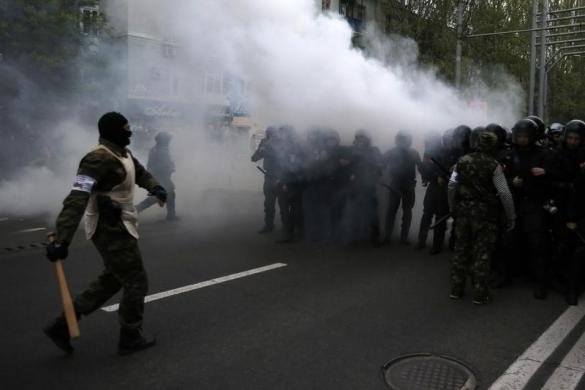 В руках у них були щити і біти. З їхнього боку лунали постріли, представники Донецької народної республіки кинули в колону мітингувальників світлошумову гранату, закидали фарбою активістів.