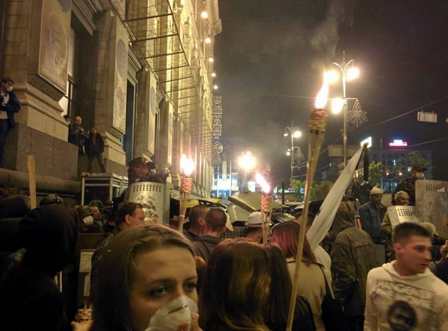 Кількадесят хвилин тому активісти СНА зібралися під будівлею Київради та рушили смолоскипною ходою убік Майдану. Біля барикади, що напвпроти Головпоштамту, колону зупинили. Почалася бійка.