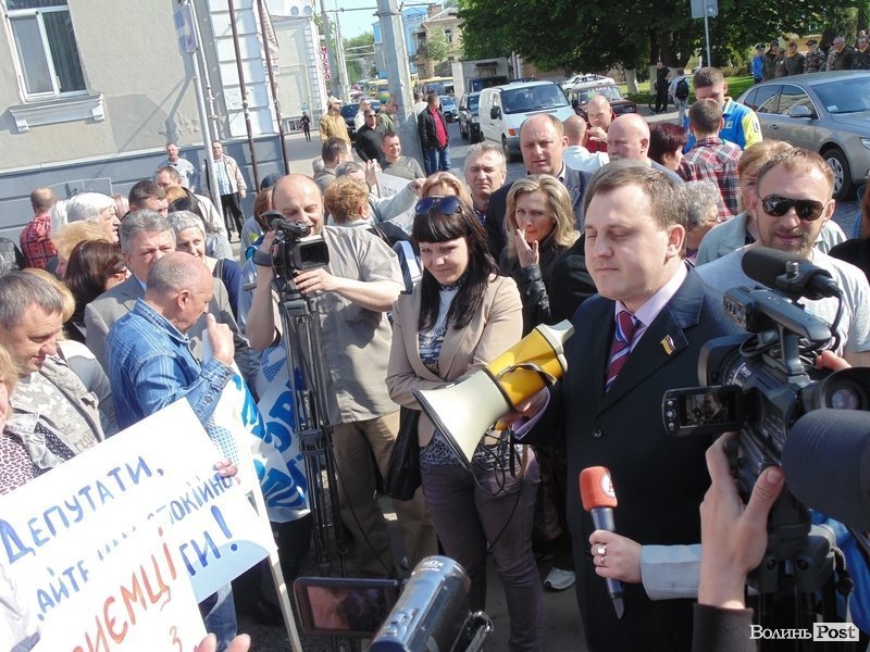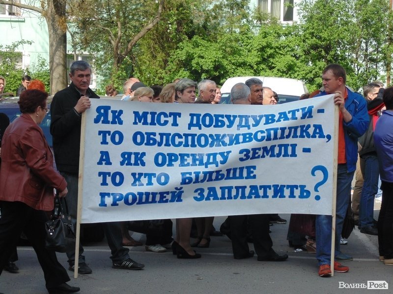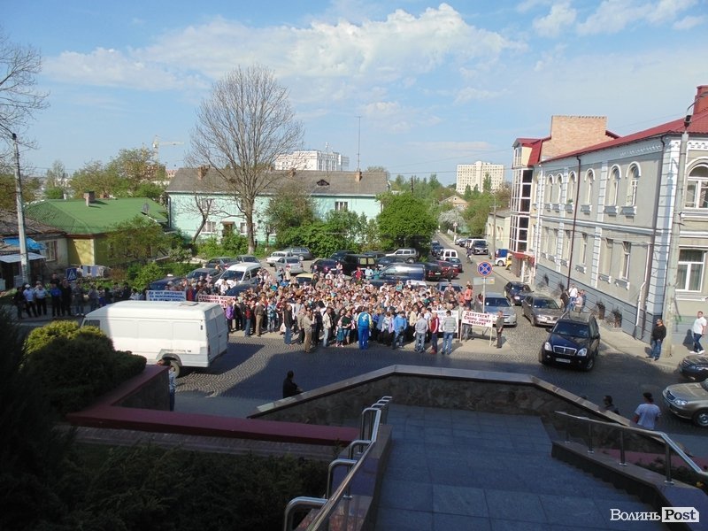 Близько 200 підприємців прийшли під Луцьку міську раду, щоб підтримати проект депутата Євгенія Ткачука щодо скасування рішення про розірвання договору оренди землі із облспоживспілкою.