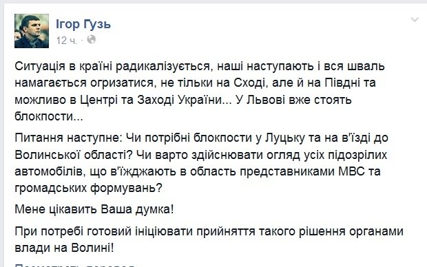 «Питання наступне: Чи потрібні блокпости у Луцьку та на в'їзді до Волинської області? Чи варто здійснювати огляд усіх підозрілих автомобілів, що в'їжджають в область представниками МВС та громадських формувань?», - поставив питання Ігор Гузь.