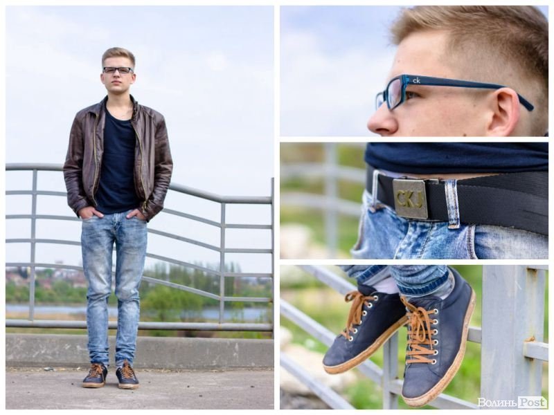На фото Валентин одягнений у куртку, футболку ZARA, штани PULL&BEAR, кеди. Зовнішній вигляд доповнюють окуляри від CALVIN KLEIN, ремінь від CKJ та годинник марки DIESEL.