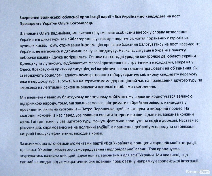 Волинський обласний осередок політичної партії «Вся Україна» звернувся до кандидата в президенти Ольгу Богомолець з проханням зняти кандидатуру на користь Петра Порошенка.